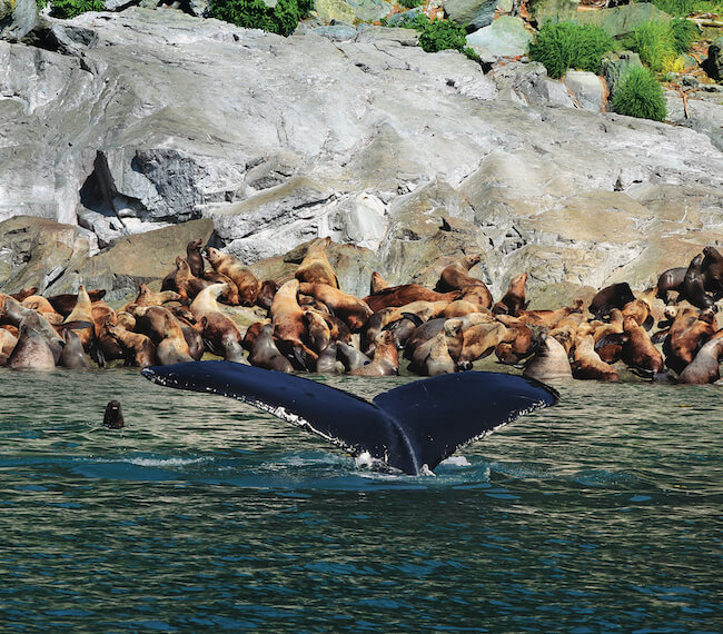 Your driver/guide will entertain you with interesting stories and facts about Juneau on your way to Auke Bay where your captain and naturalist will welcome you aboard the North Star, our state of the art 48-passenger jet boat custom designed for Juneau whale watching—large windows, an outside viewing deck and an amplified hydrophone system for listening to whales communicate under water. You’ll have a beautiful view of the Mendenhall Glacier as you travel in and out of Fisherman’s bend. Provided binoculars may enhance your panoramic view of whales and other marine mammals like sea lions, seals and porpoises. Whale sightings are guaranteed!